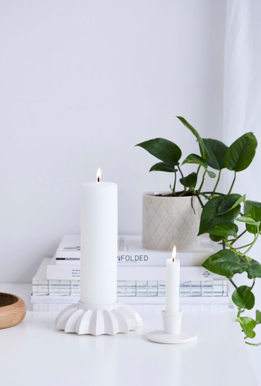 The Alba collection by Dottir is a celebration of light and simplicity, designed to elevate any space with its striking candleholders. Inspired by the soft glow of dawn, Alba captures the serene beauty of morning light and channels it into timeless, sculptural forms. Each candleholder is crafted from premium ceramic with a matte finish, giving it a modern yet organic appeal.